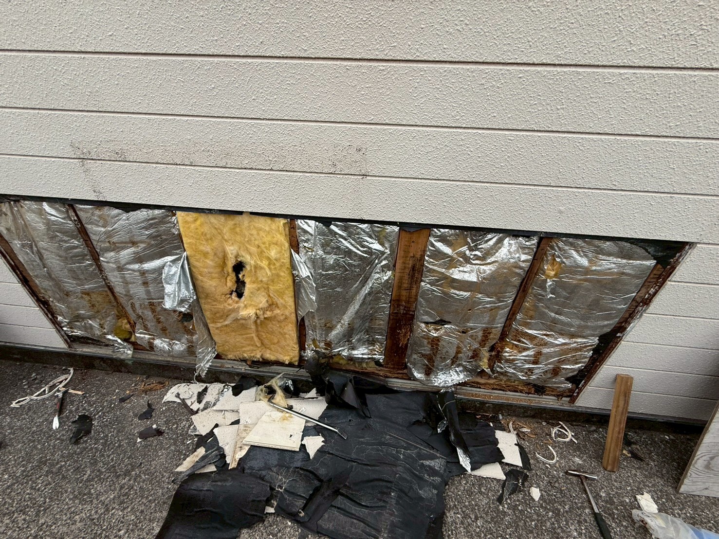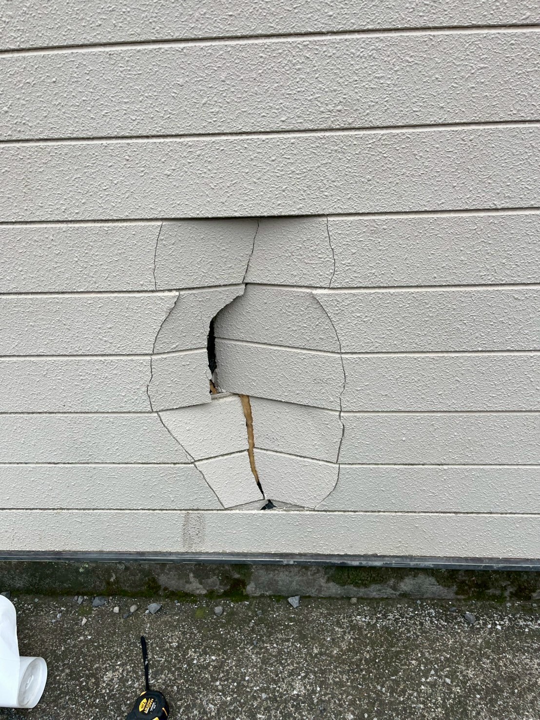 外壁のひび割れおよび破損箇所について、下地の状態を確認したうえで、補修工事を行いました。