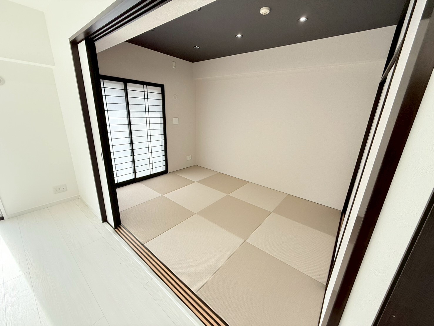 畳の向きを市松模様に敷くことで、光の当たり方による表情の違いも楽しめる空間となっております。