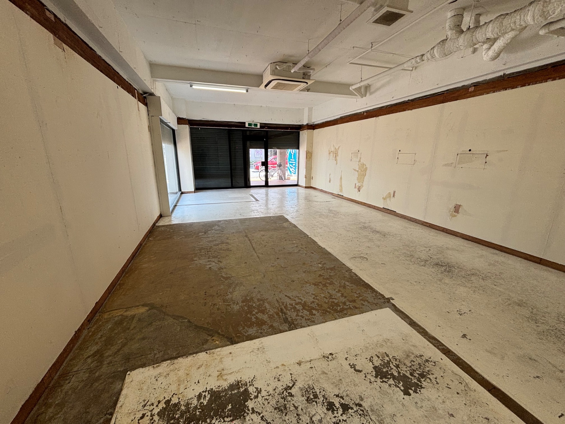 既存の床は凹凸や劣化が見られる状態でしたが、下地を丁寧に調整し、床面を均一に整えています。