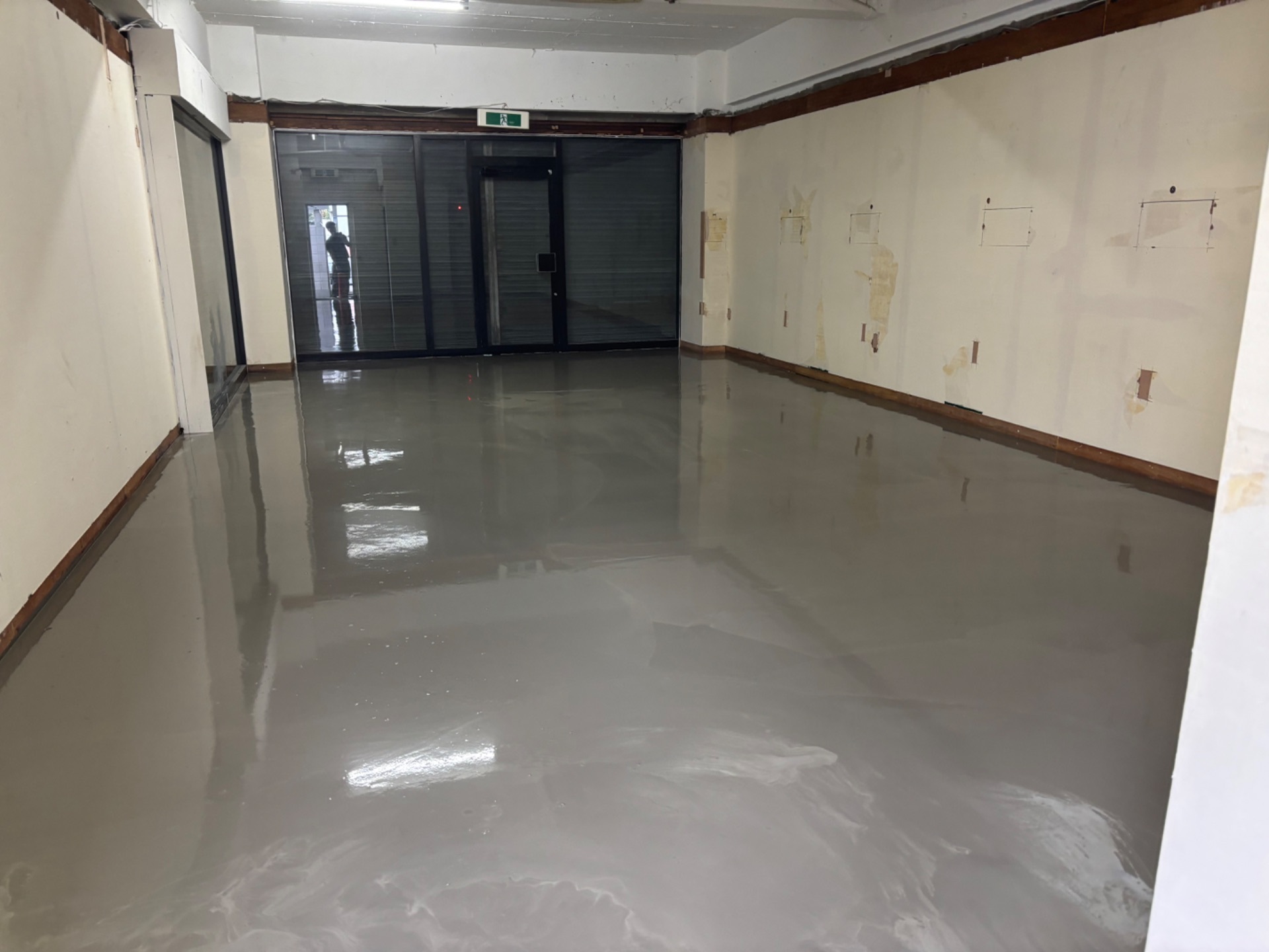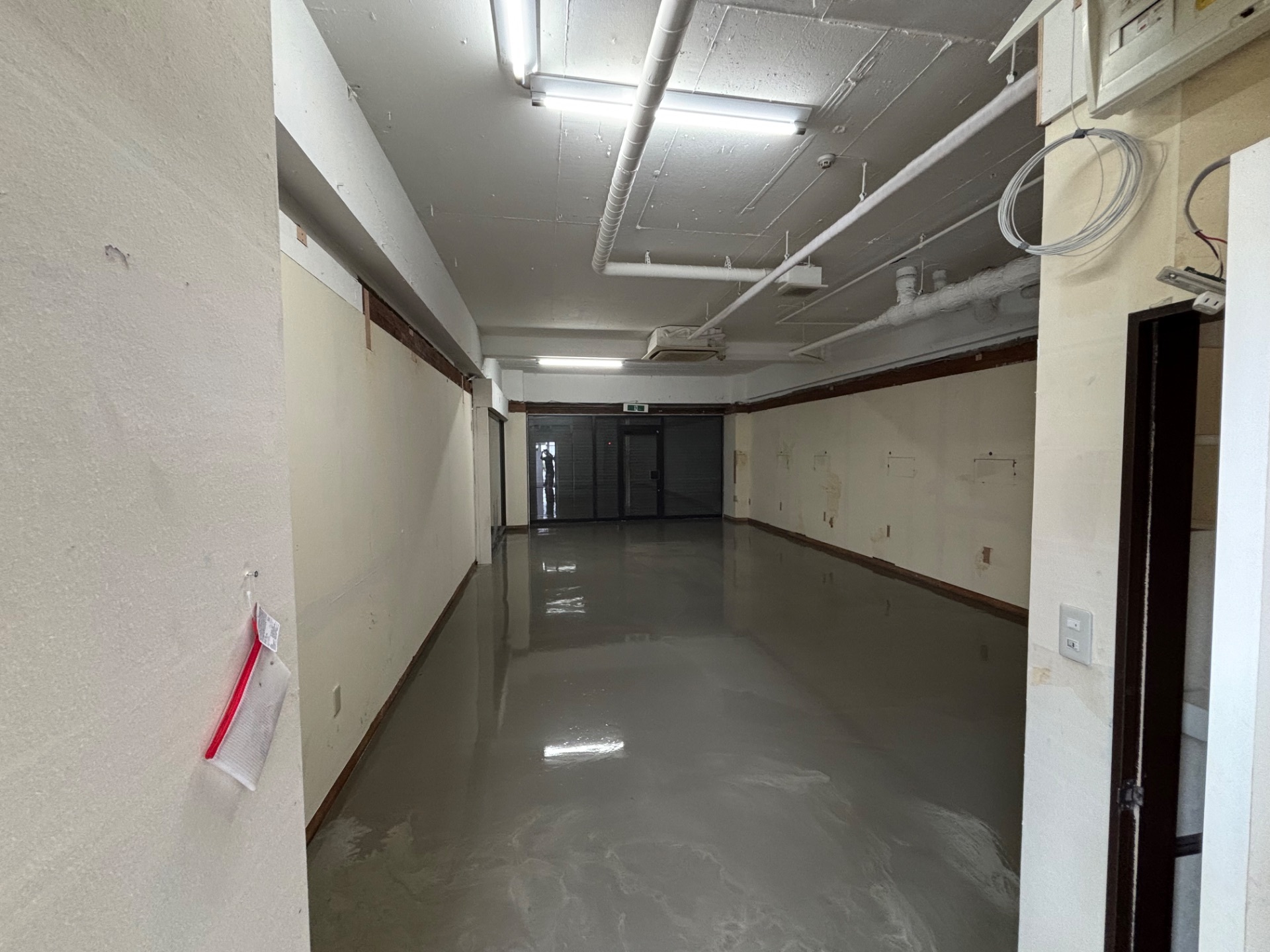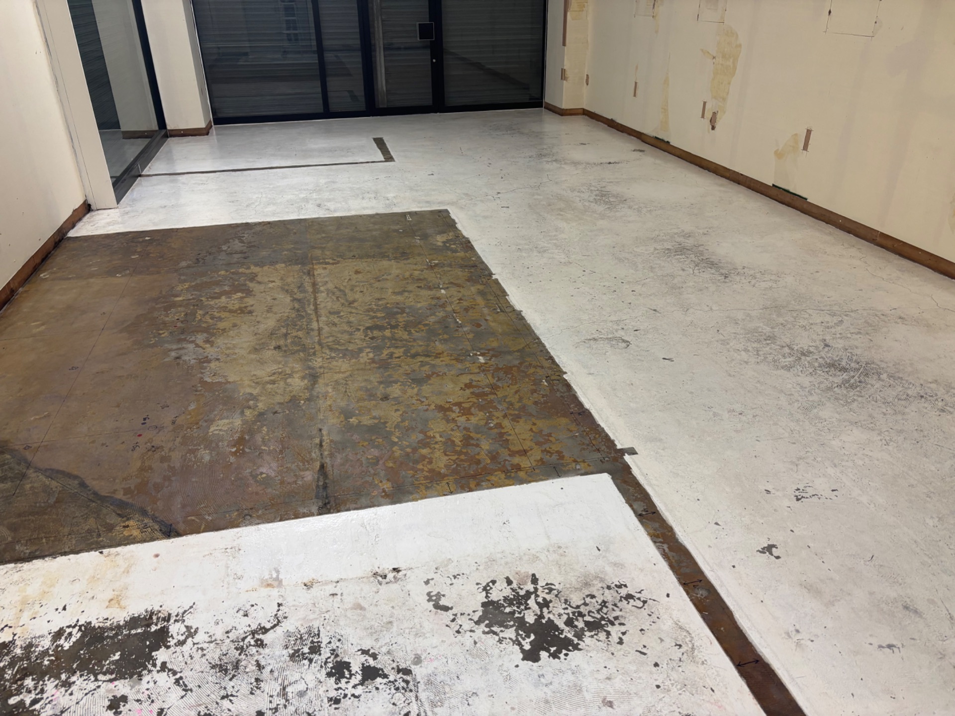 今回、室内床の仕上げ工事に向けて、レベリング材を使用した下地調整を行いました。